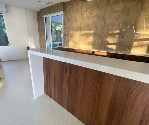 Un comptoir monolithique, lumineux, parfaitement structuré.