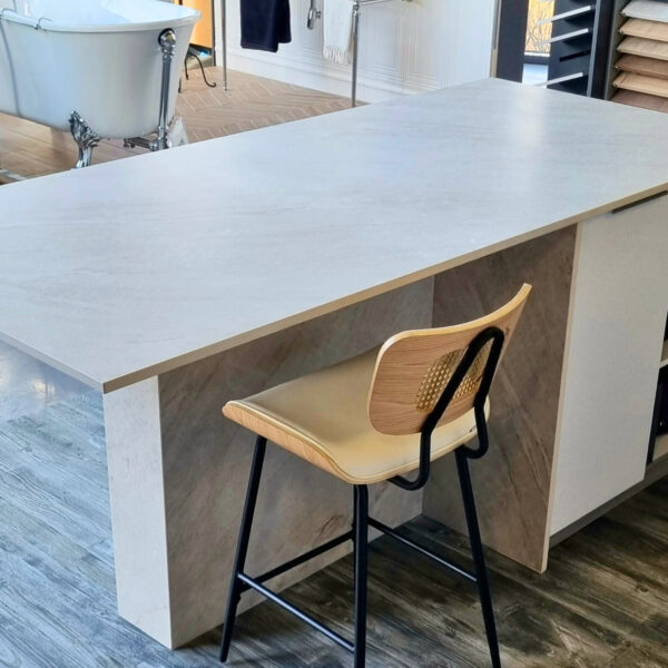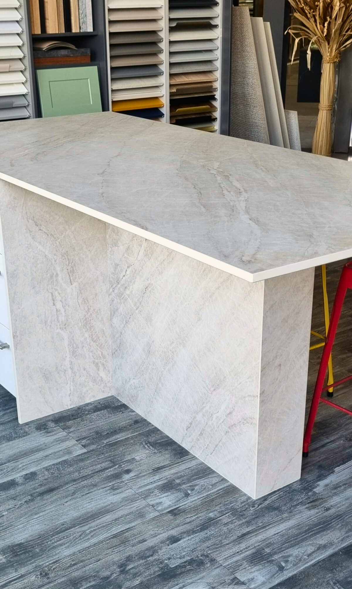 Ce meuble en Infinity Taj Mahal a été conçu comme une zone de présentation professionnelle, proche d’un îlot de cuisine avec pied central.