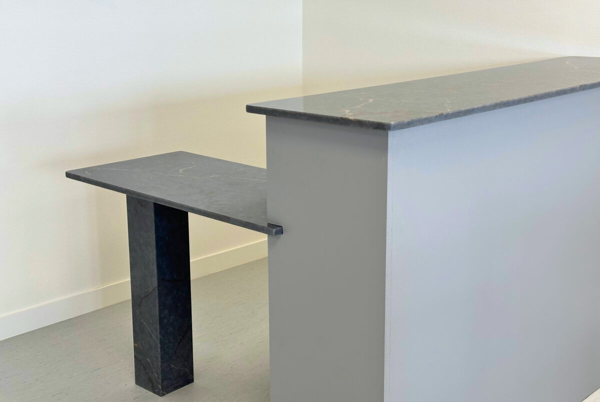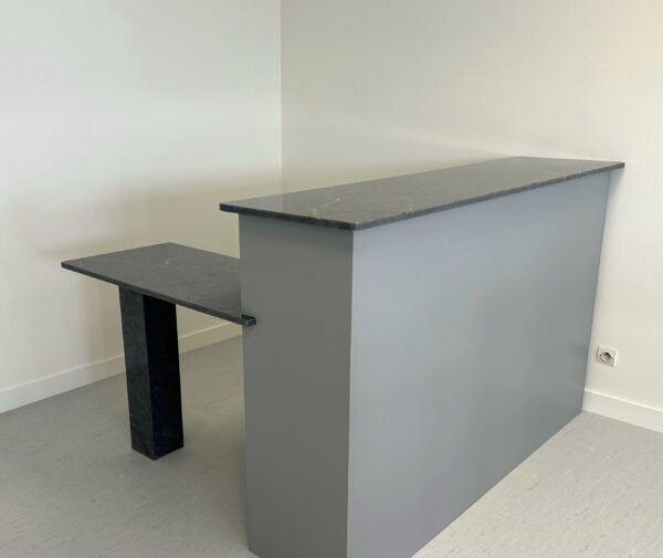 Ce comptoir en Silestone Parisien Blue a été conçu comme un espace de vente professionnel, avec une zone en retrait entièrement habillée dans la même matière.