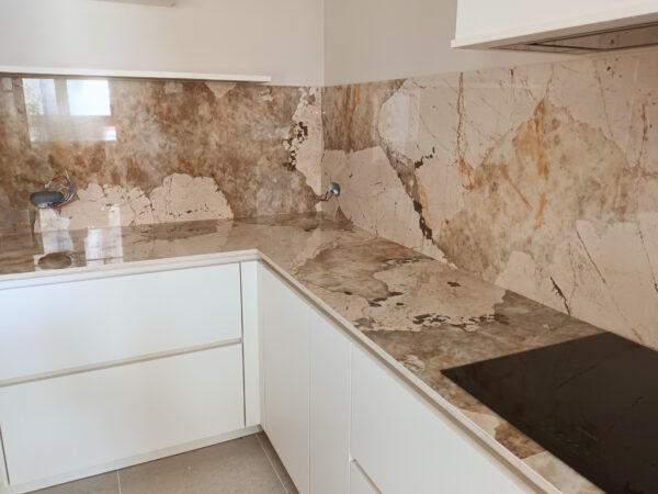 Le défi principal a été la gestion des suivis de veinage sur de grandes longueurs et la jonction des crédences. Le raccord dans la zone crème a permis une transition naturelle et élégante.