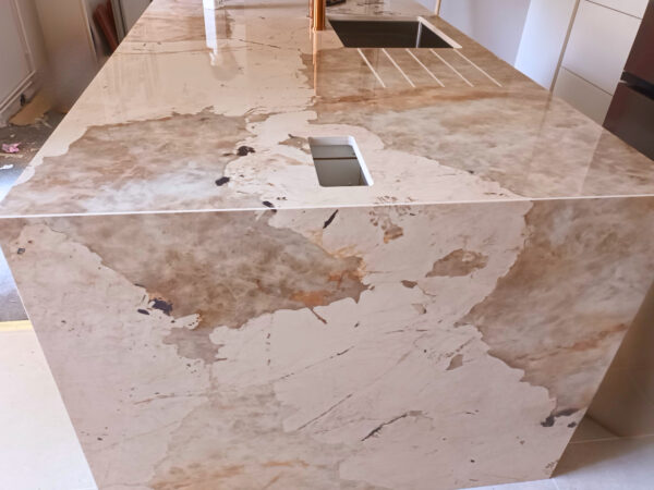 L’îlot inclut un jambage en coupe d’onglet parfaitement veiné, renforçant l’effet massif et haut de gamme de l’ensemble.
