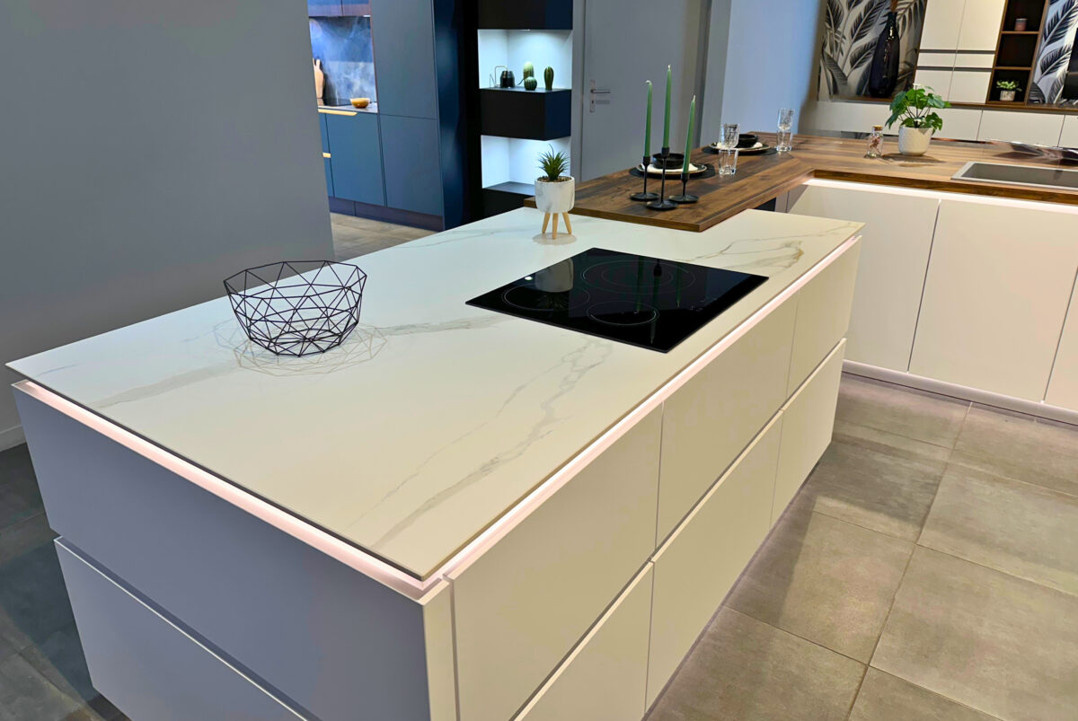 Ce projet met en valeur un plan en Infinity Calacatta Oro venant sublimer des meubles stratifiés imitation bois. Les veines orange du matériau s’accordent parfaitement avec les tons chauds des meubles.