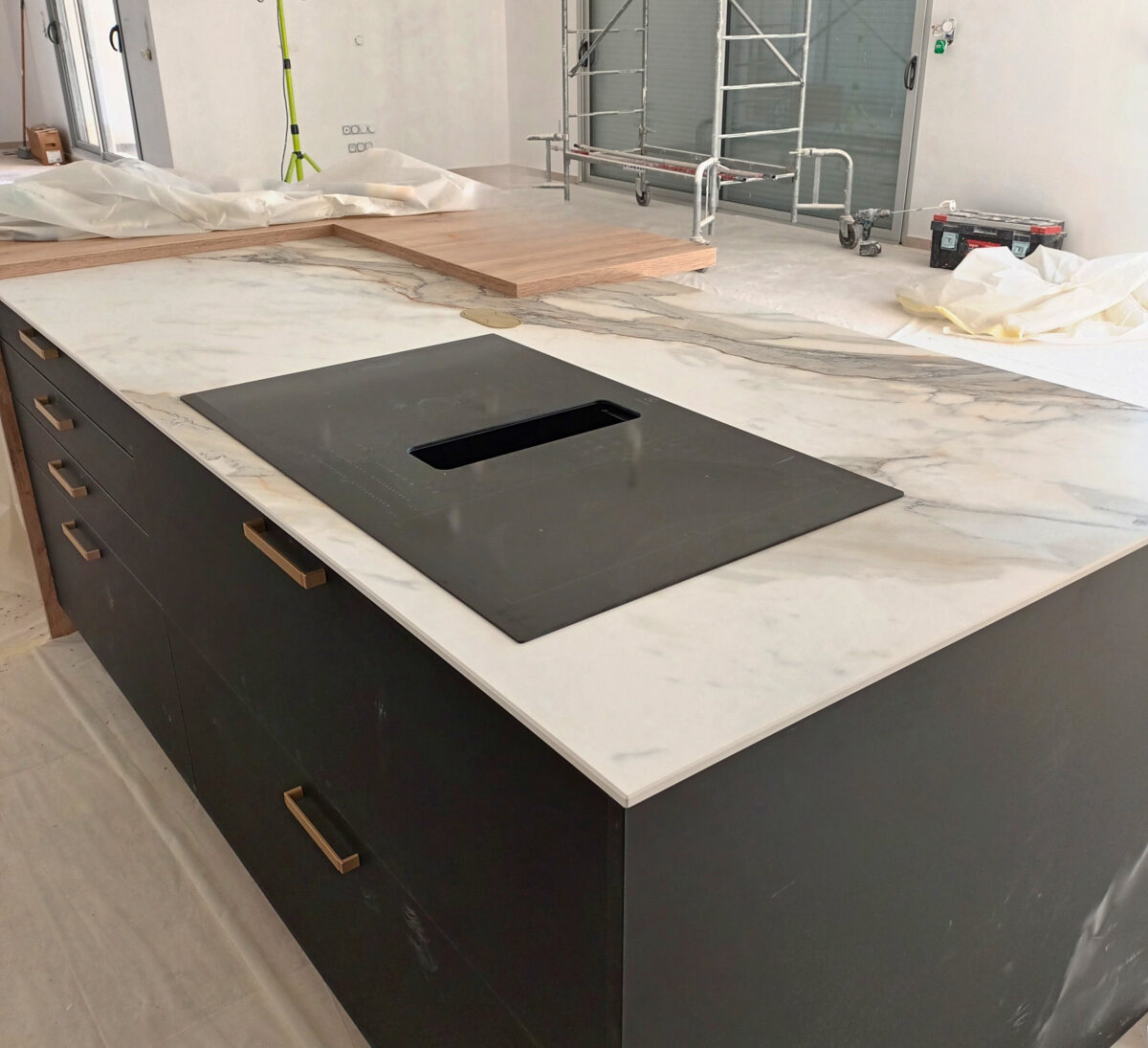 Le Calacatta Hermitage apporte une esthétique singulière, mélange de classicisme et de modernité. Dans ce projet, le plan vient s’appuyer sur un snack stratifié, nécessitant un callage précis pour obtenir un ensemble parfaitement aligné.