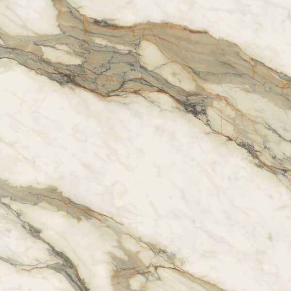Le Calacatta Hermitage dévoile un veinage bleu, gris et orange très graphique, offrant une identité visuelle forte.