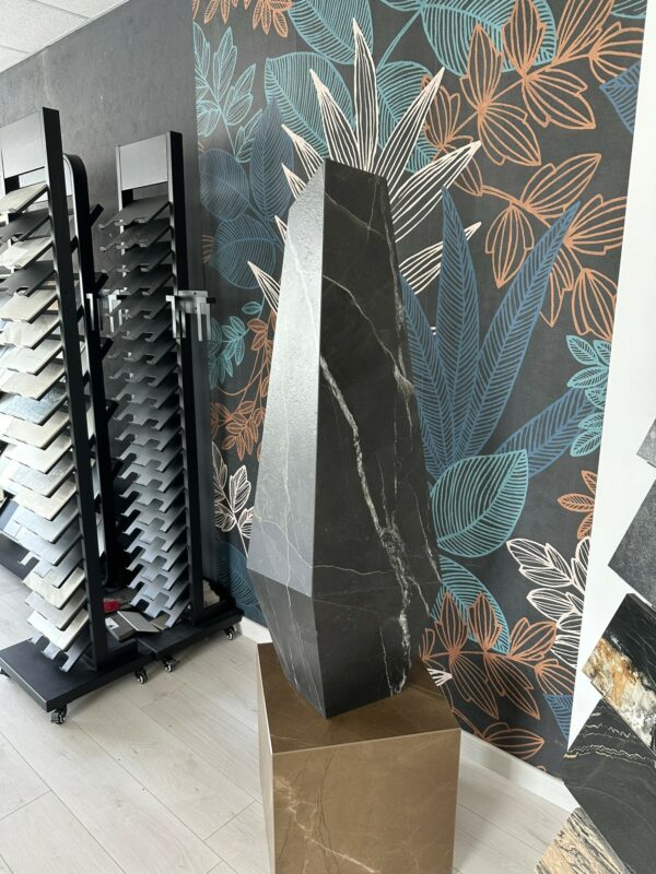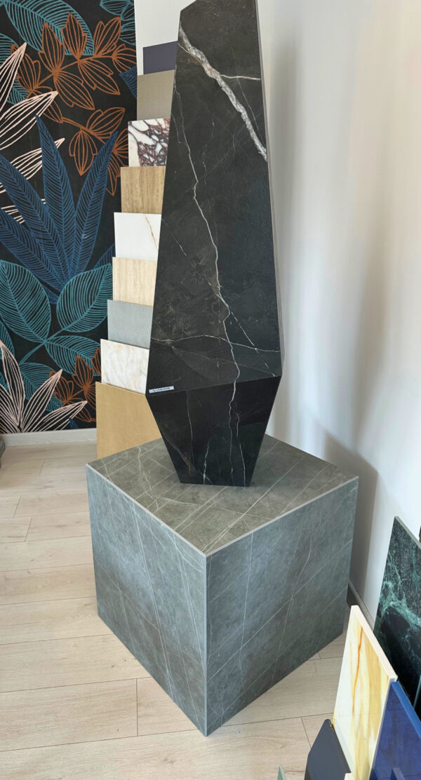 Ce totem en Laminam Calacatta Black est entièrement réalisé en coupe d’onglet collée, avec un suivi de veinage sur l’ensemble de la structure.