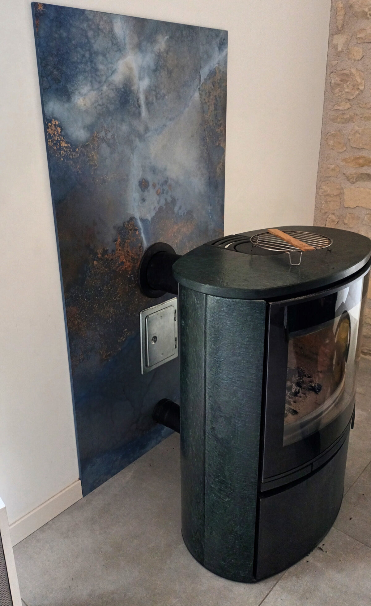 Le principal défi consistait à anticiper chaque perçage et découpe avant la pose afin d’assurer une intégration parfaite autour du poêle. La céramique devait également répondre aux contraintes thermiques liées à la chaleur dégagée.