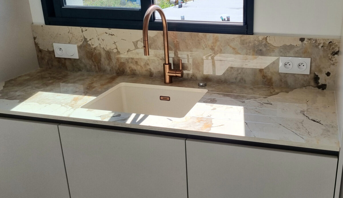 Le principal défi concernait l’ajustement du plan entre deux murs sans marge d’erreur. L’intégration de la fenêtre et des prises dans la crédence demandait également une grande rigueur lors de l’usinage.