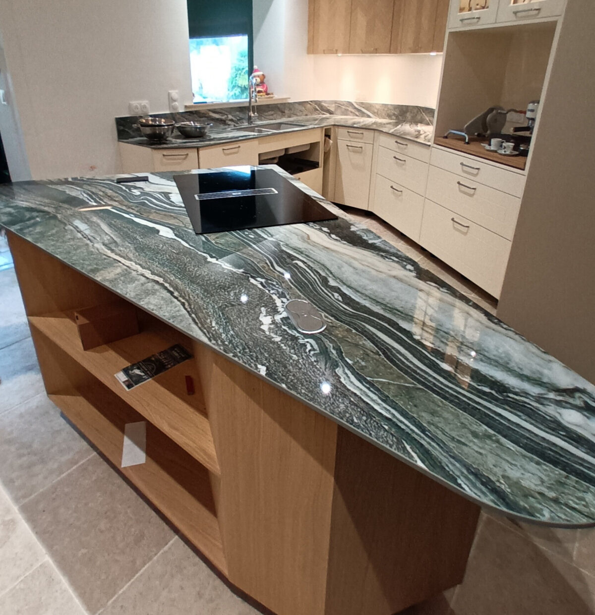 Le principal défi résidait dans la conception de l’îlot triangulaire : angles, rayons et alignement du veinage demandent une anticipation parfaite. Le raccord miroir sur la partie en L a été calé pour magnifier la matière.