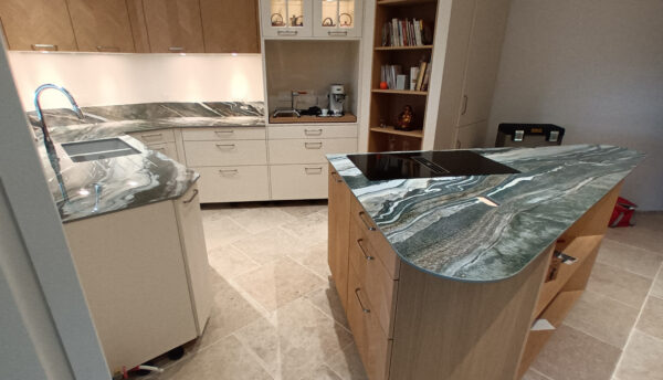 Ce projet singulier en Infinity Royal Peacock se distingue par un îlot triangulaire aux arêtes adoucies. La forme atypique a imposé un métrage minutieux et un façonnage complexe.