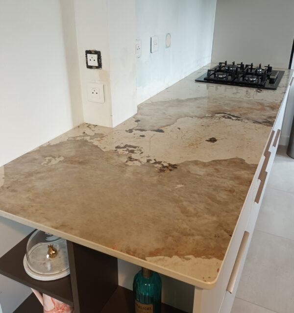Ce projet en Dekton Khalo présente un plan de travail avec découpe pour une plaque gaz, nécessitant une attention particulière liée à la chaleur dégagée par chaque foyer. Le plan a également été façonné pour épouser un décroché mural.
