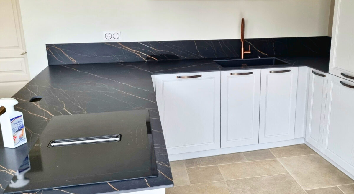 Dans cette cuisine en Infinity Royal, l’accent a été mis sur le raccord des plans, où un suivi de veinage précis a été réalisé. La cuisine en L permet une belle mise en scène de la matière.