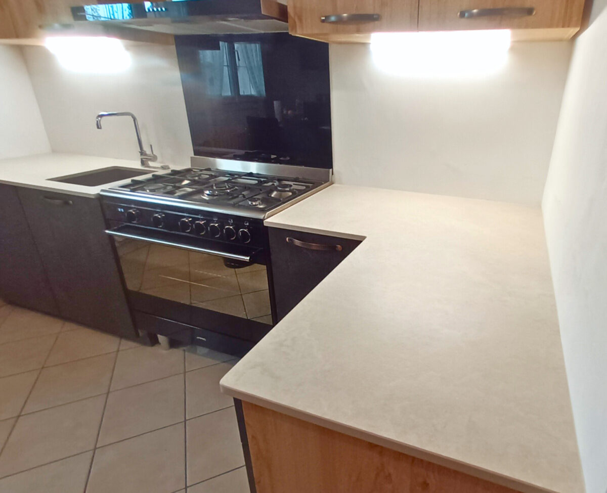 Ce projet en Infinity Chianca di Ostuni présente un plan de travail nécessitant une découpe parfaitement calibrée autour d’une gazinière. Les plans doivent se rejoindre tout en permettant le retrait indépendant de l’appareil.