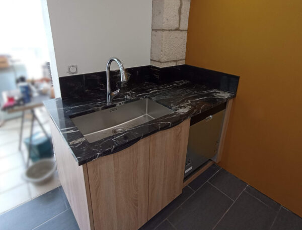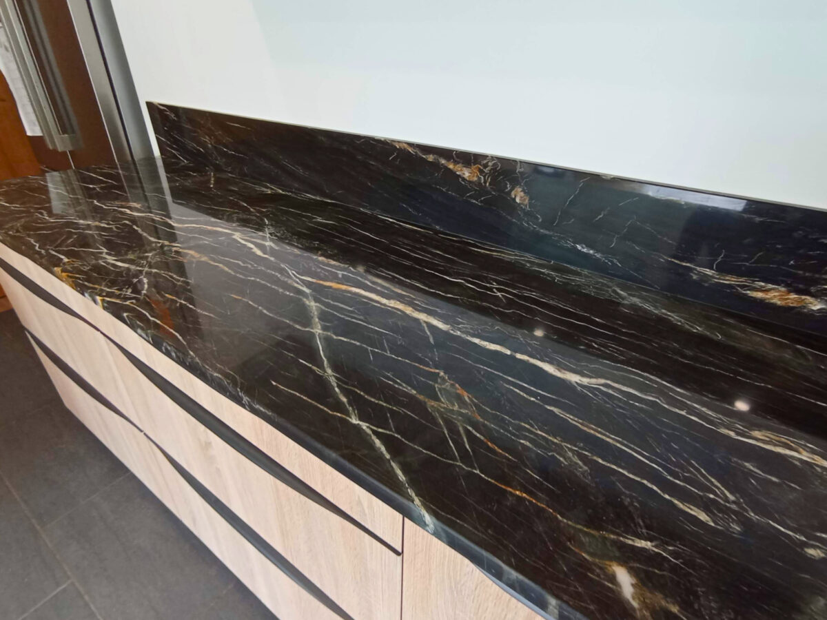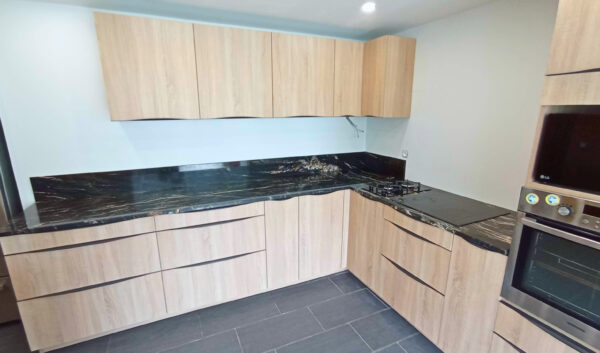Ce projet en Quartzite Belvedere inclut quatre crédences réalisées en coupe d’onglet afin de suivre parfaitement la forme d’un poteau. Ce choix permet de minimiser les joints visibles et d’assurer une élégance maximale.
