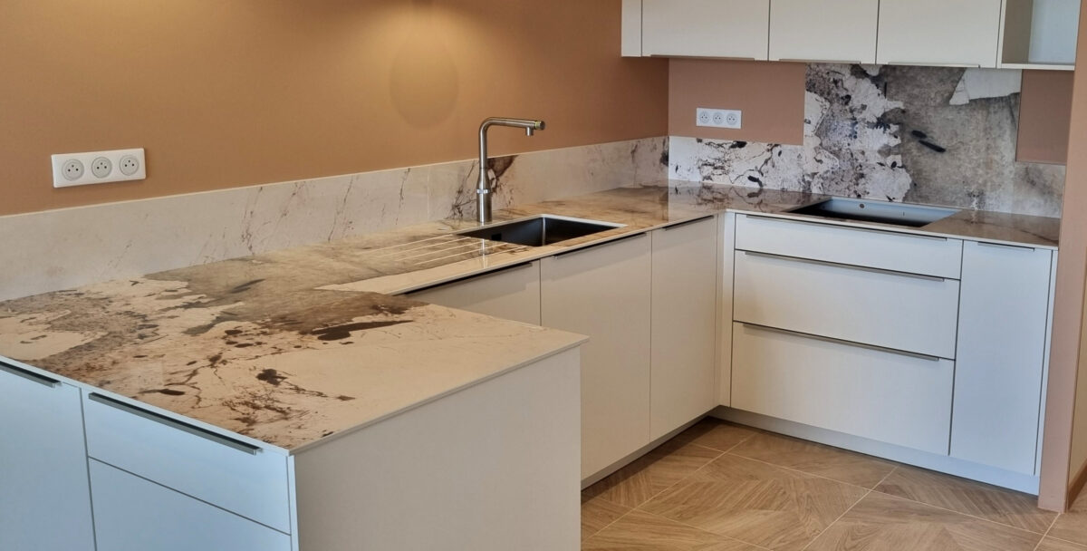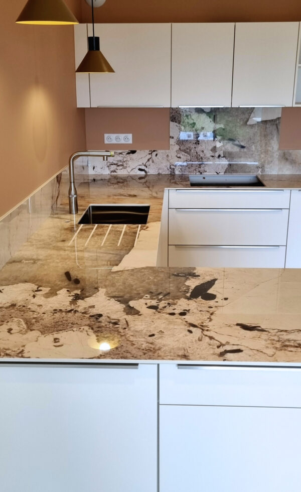 L’Infinity Magellano est une matière très marquée qui nécessite un calepinage minutieux pour aligner les motifs. Dans ce projet, un raccord parfait a été réalisé entre le plan principal et le retour du plan cuve.