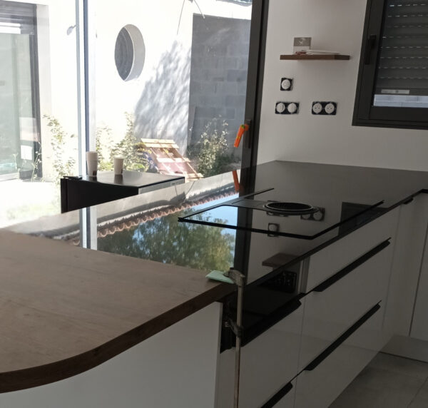 L’ensemble blanc et noir, réchauffé par un snack effet bois, crée une ambiance moderne et équilibrée. Ce granit, l’un des plus denses que nous travaillons, est reconnu pour sa solidité exceptionnelle.