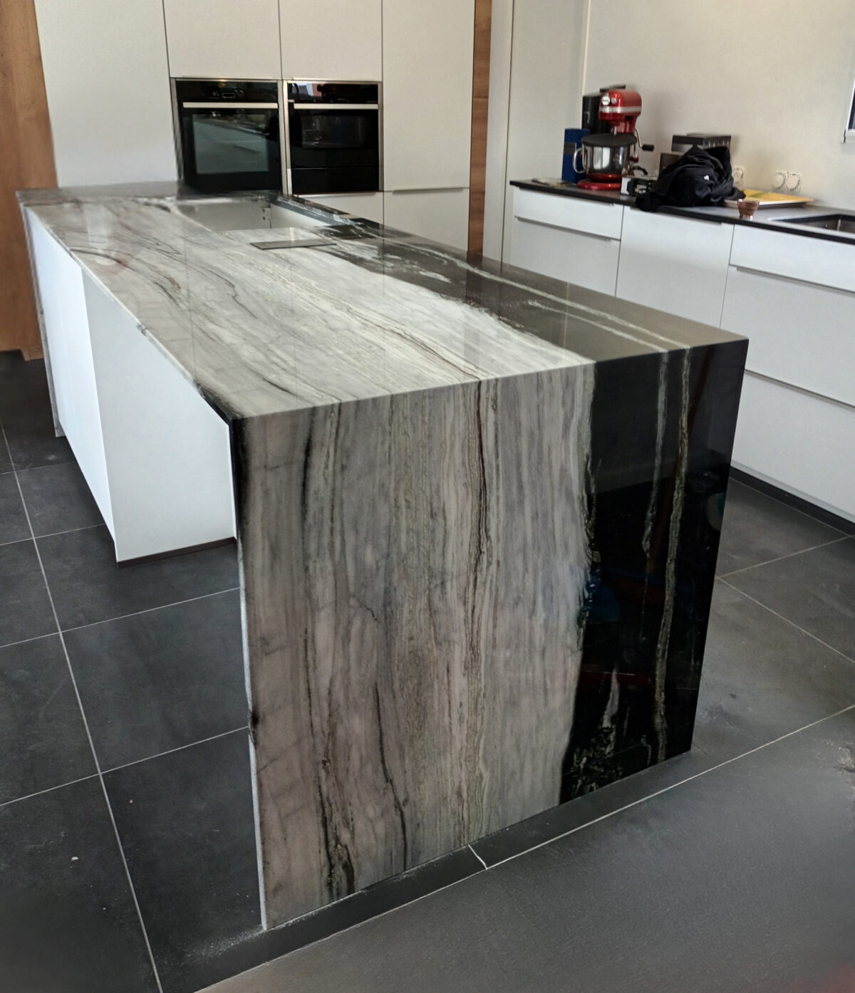Ce projet en Quartzite Panda White reprend le principe d’un jambage en coupe d’onglet avec effet miroir, mais présente une complexité supplémentaire : une grande partie en porte-à-faux destinée à servir de réception.