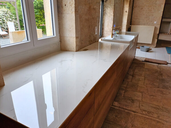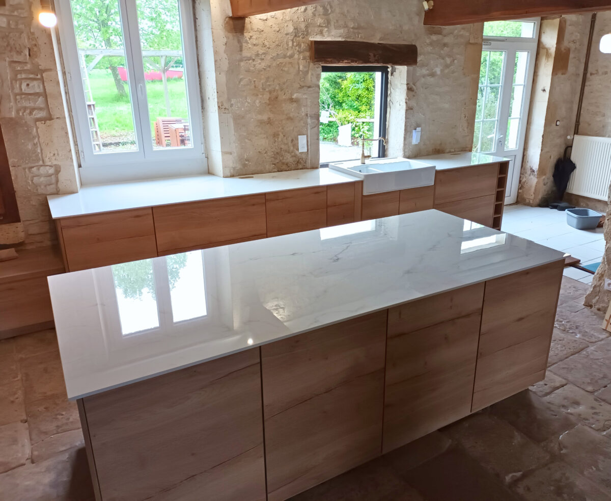Le défi technique résidait dans l’association de deux contraintes : l’évier timbre, très délicat à intégrer, et le mur en pierre au contour irrégulier. La combinaison des deux nécessite une précision extrême.