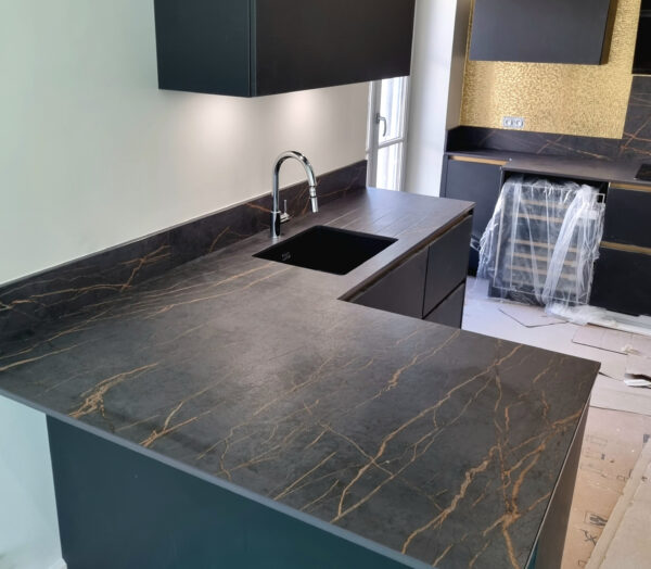 Ce projet en Dekton Laurent se compose d’un ensemble de plusieurs plans dont un L accueillant la cuve, avec un suivi de veinage parfait entre les deux éléments. Le retour du plan côté cuve bénéficie également d’un débord pour créer un espace snack.