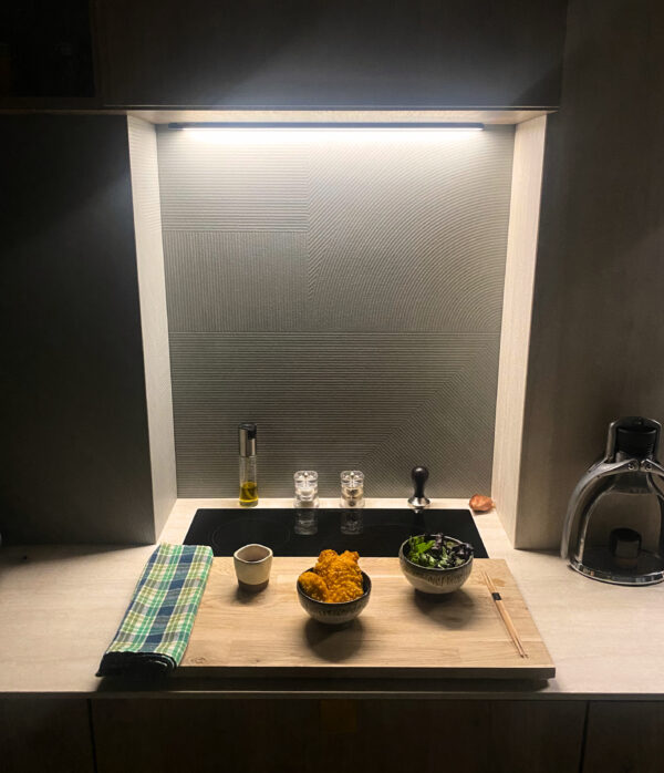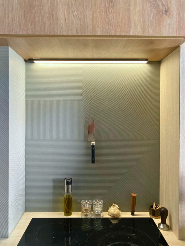Une cuisine zen en Laminam Travertino Bianco & Infinity Midori