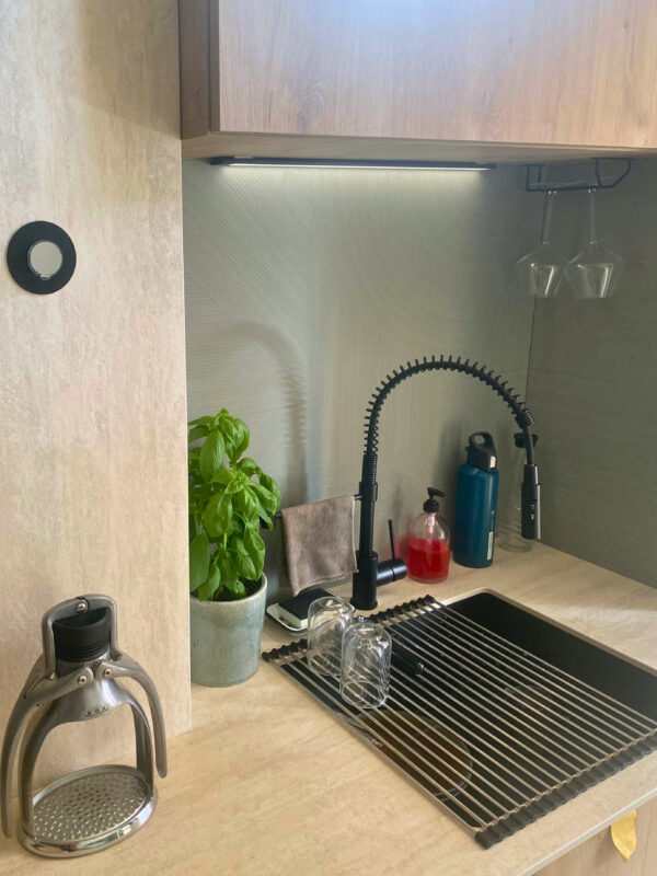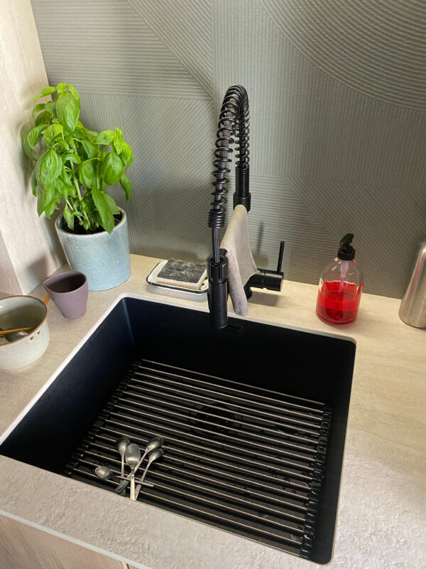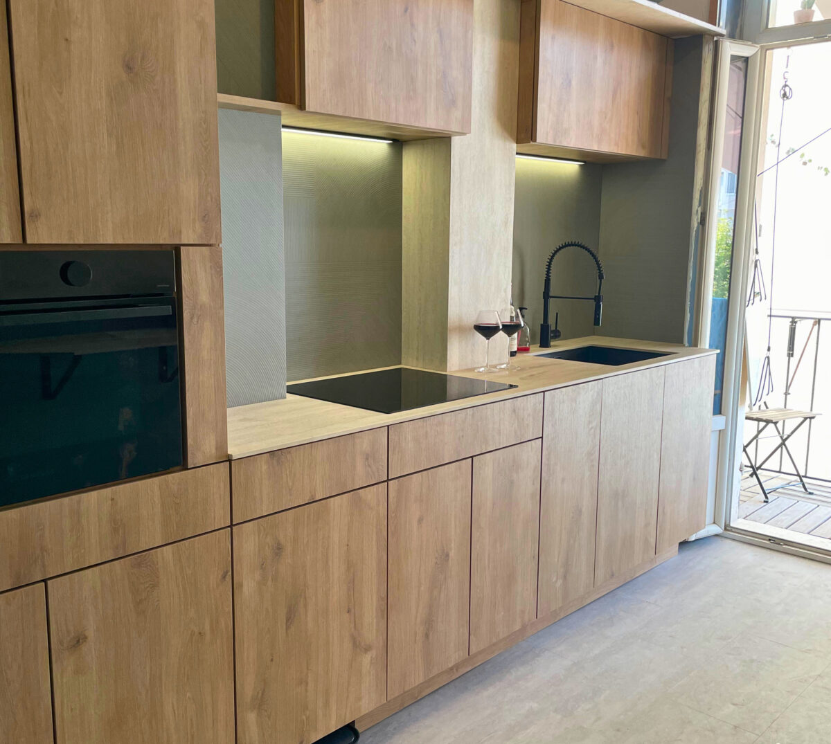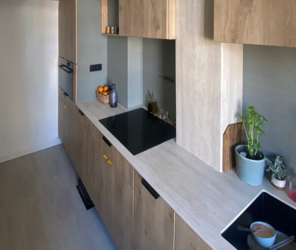 Le défi consistait à gérer un plan monobloc avec plusieurs décrochements, tout en assurant un alignement parfait des crédences en coupe d’onglet pour une finition presque sans joint.