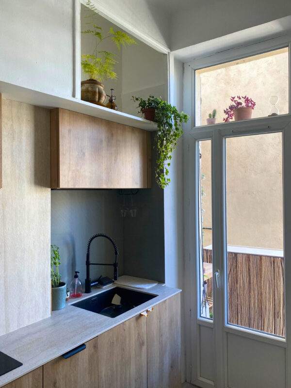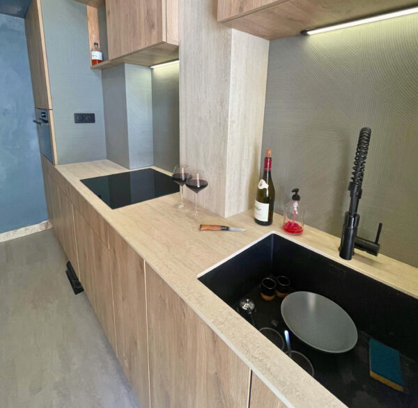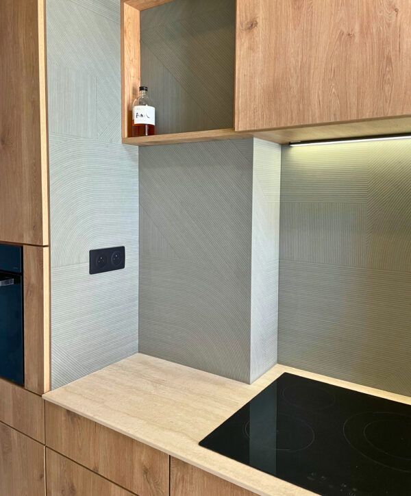 Ce projet associe un plan en Laminam Travertino Bianco à des crédences en Infinity Midori. Le mariage du beige minéral et du vert pastel crée une atmosphère zen, douce et apaisante.