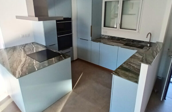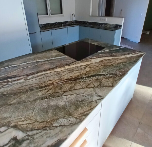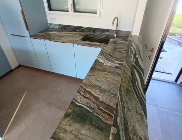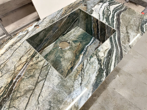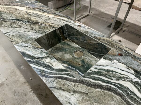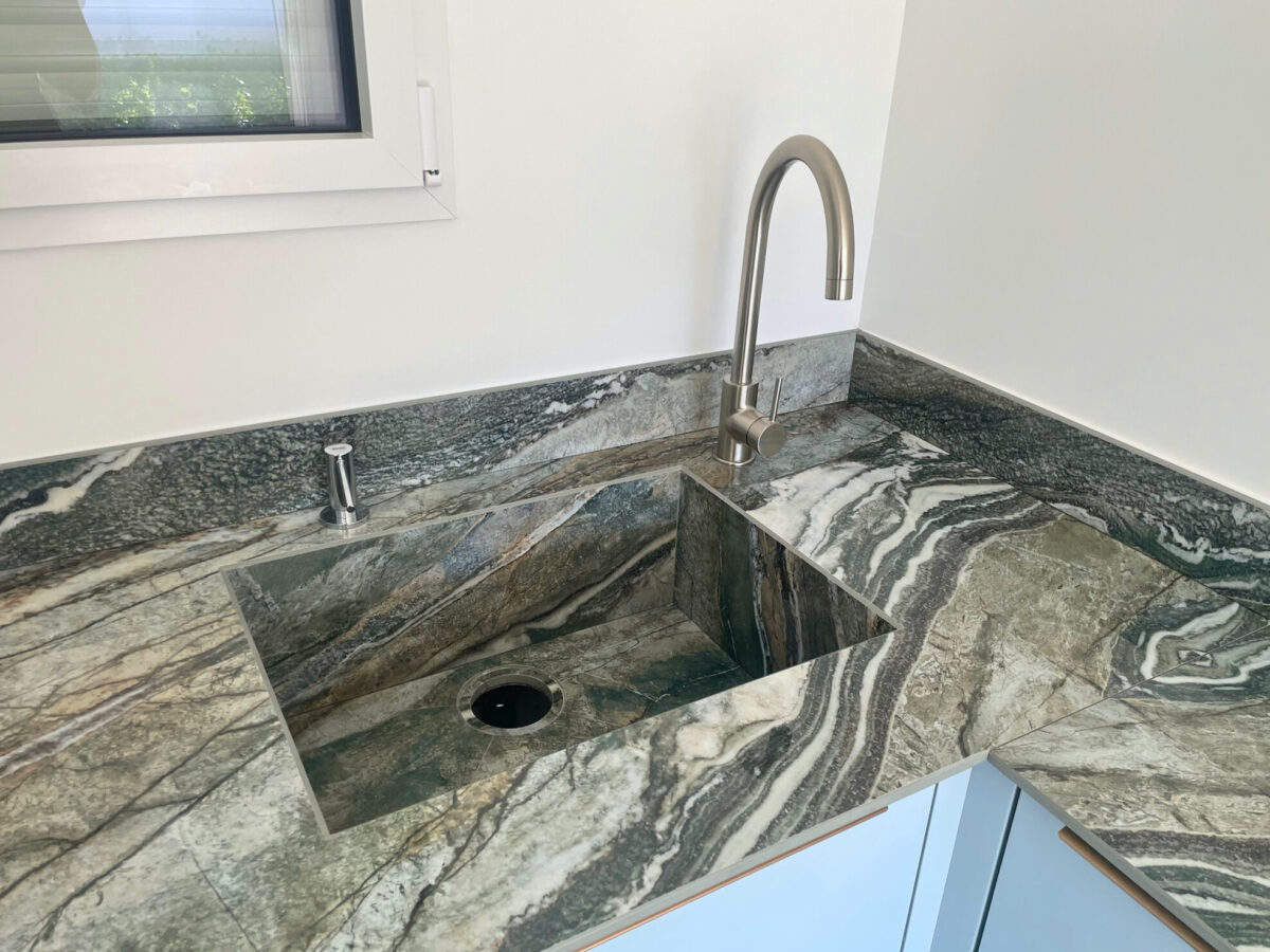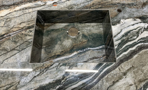 Ce projet en Infinity Royal Peacock présente une prouesse technique rare : une cuve entièrement habillée en coupe d’onglet, intégrée directement au plan sans aucun joint apparent. La cuve n’est ni sous-plan, ni sur-plan : elle fait corps avec le plan de travail.