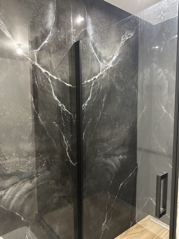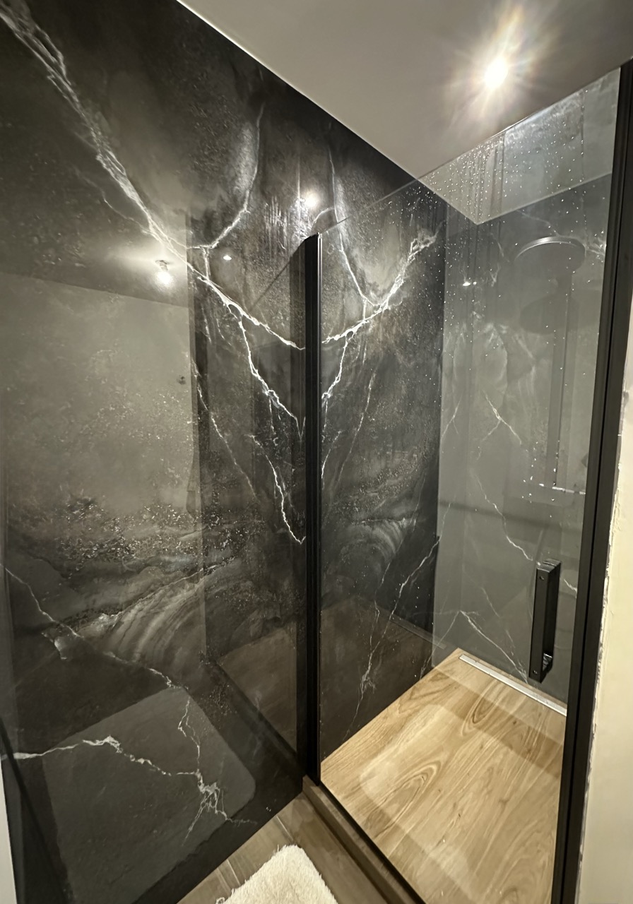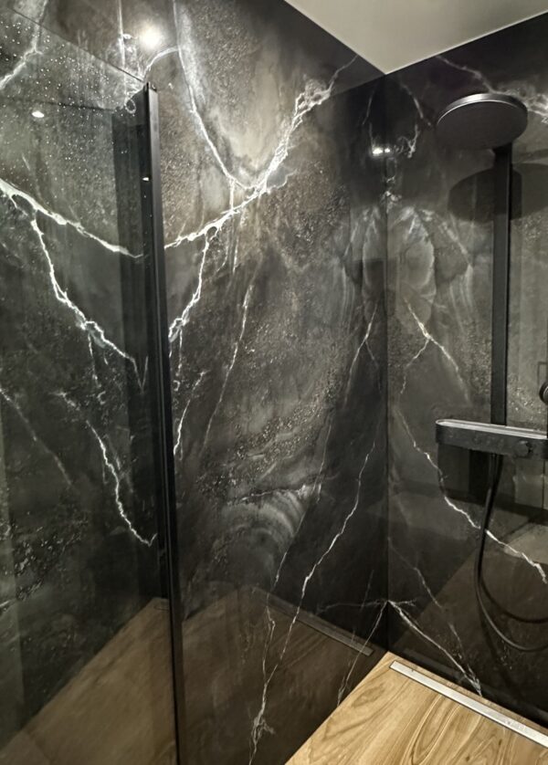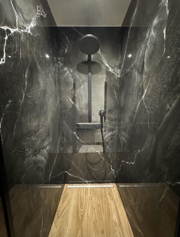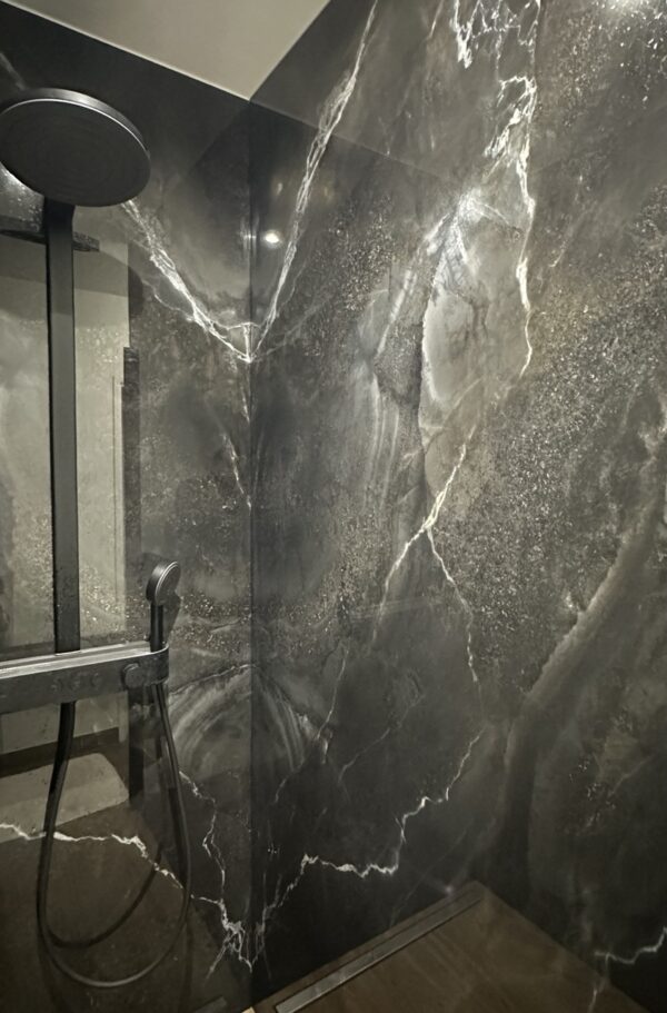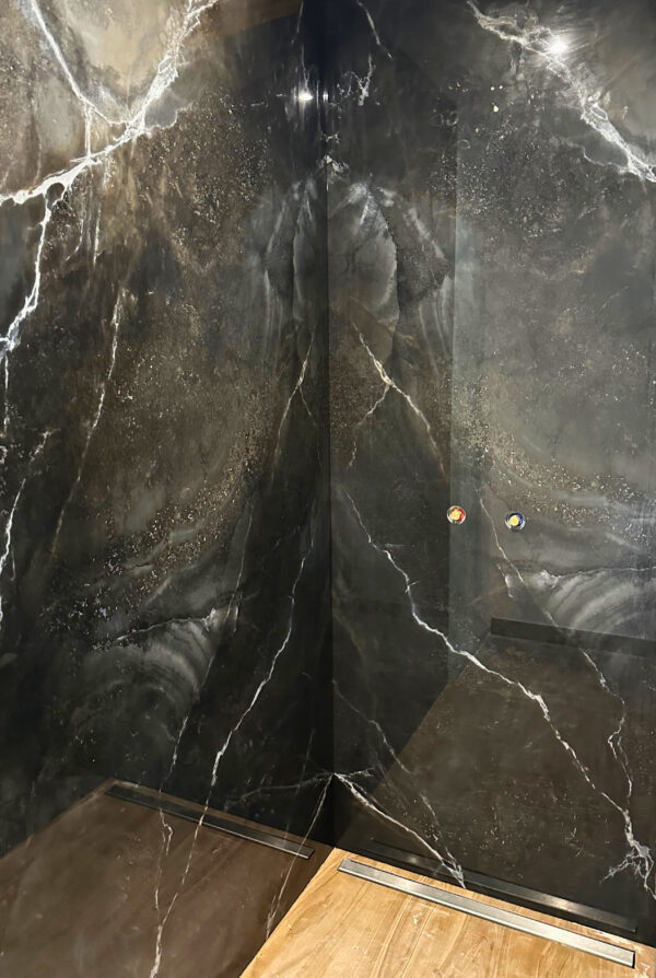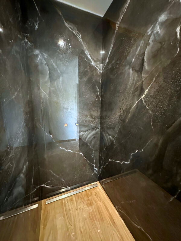 Les jonctions ont été travaillées en effet livre ouvert, offrant une lecture continue et très premium du veinage. Le receveur est réalisé en Laminam Noce avec une pente intégrée assurant l’écoulement de l’eau.