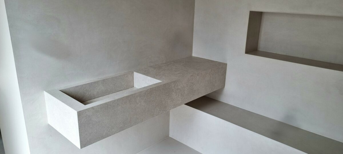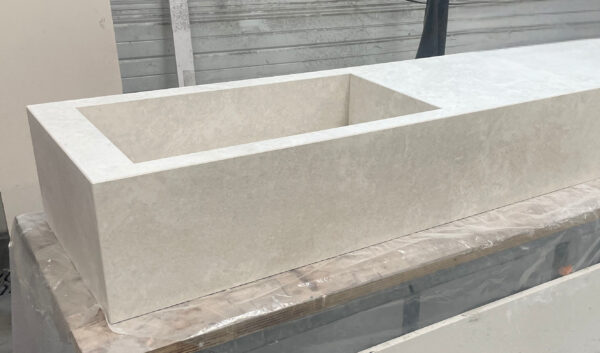 Cette vasque en Infinity Chianca di Ostuni est entièrement réalisée en coupe d’onglet avec retombées collées. Bien que creuse, elle offre un effet massif très marqué.